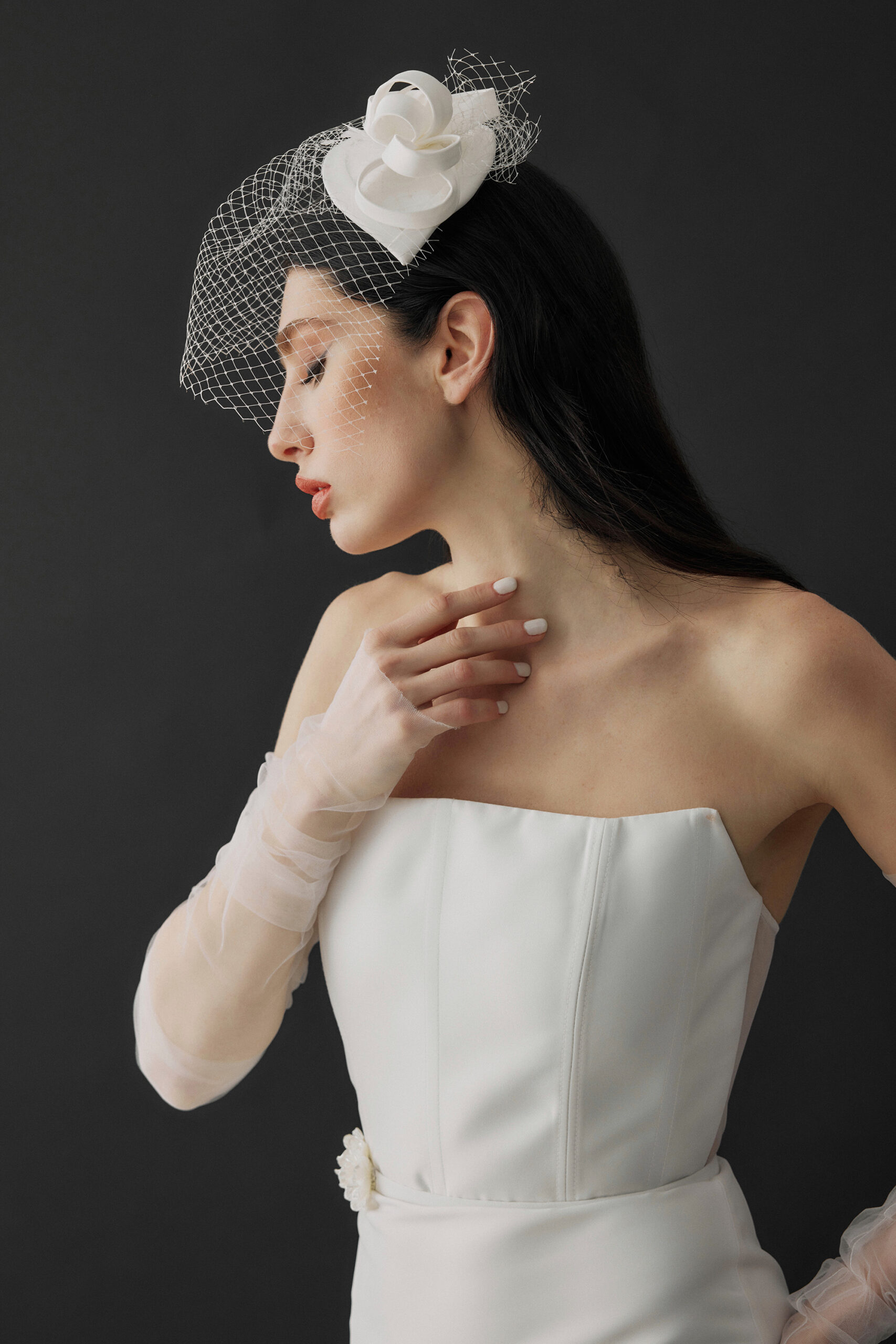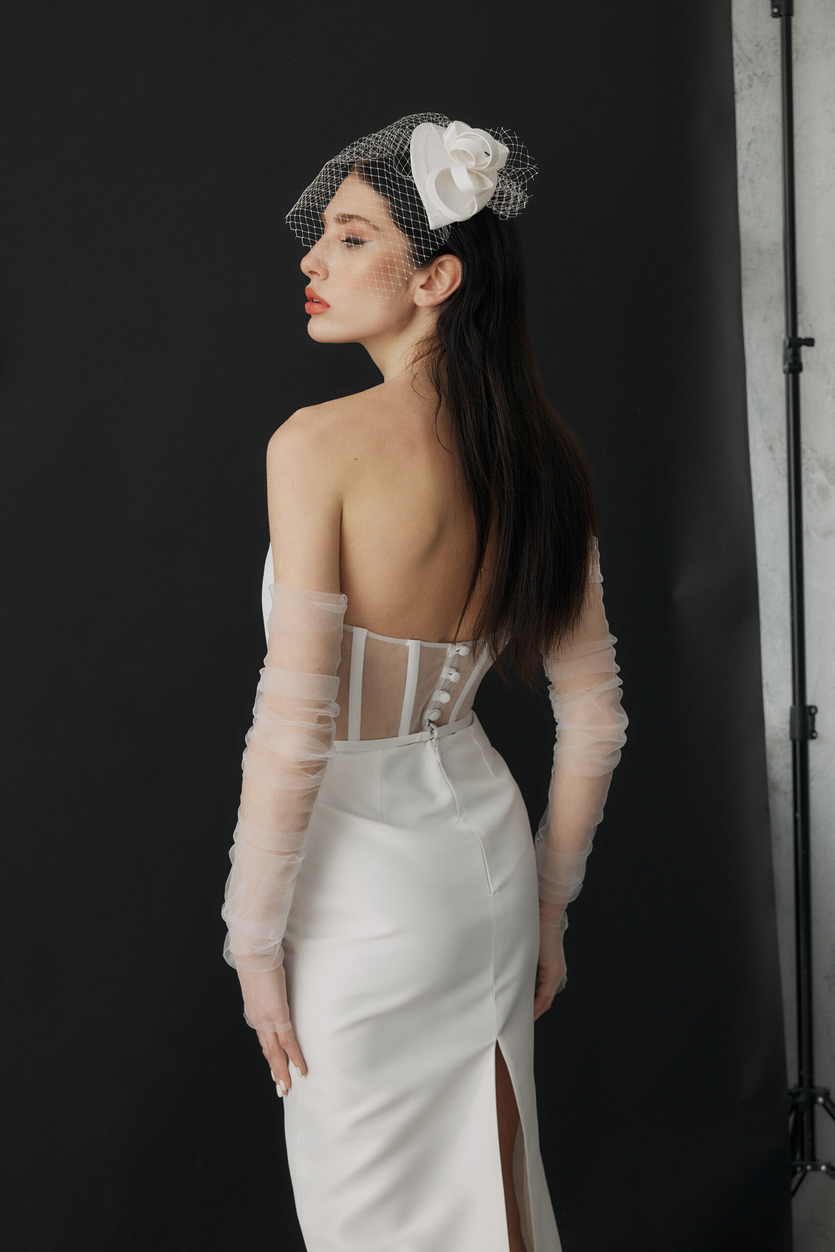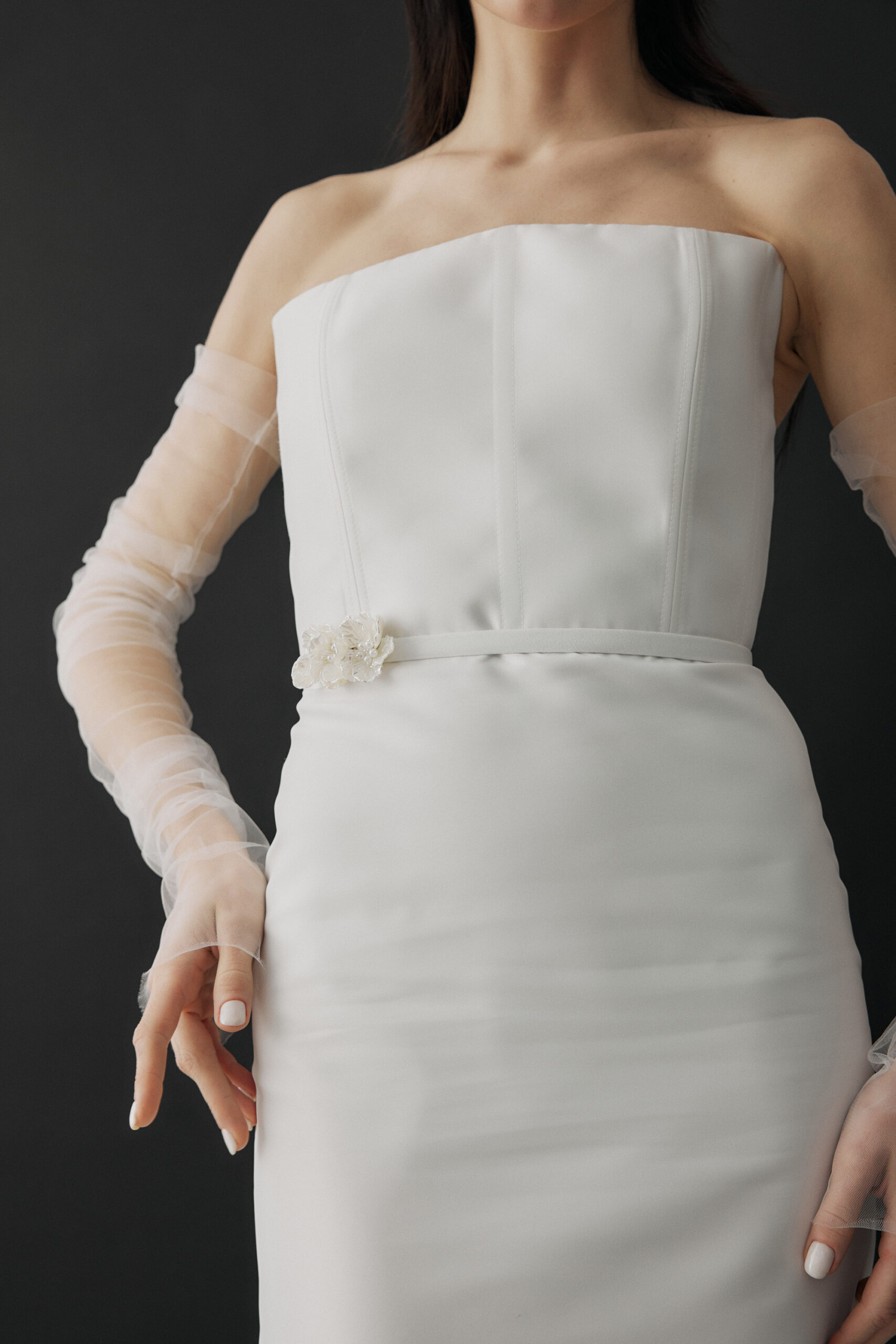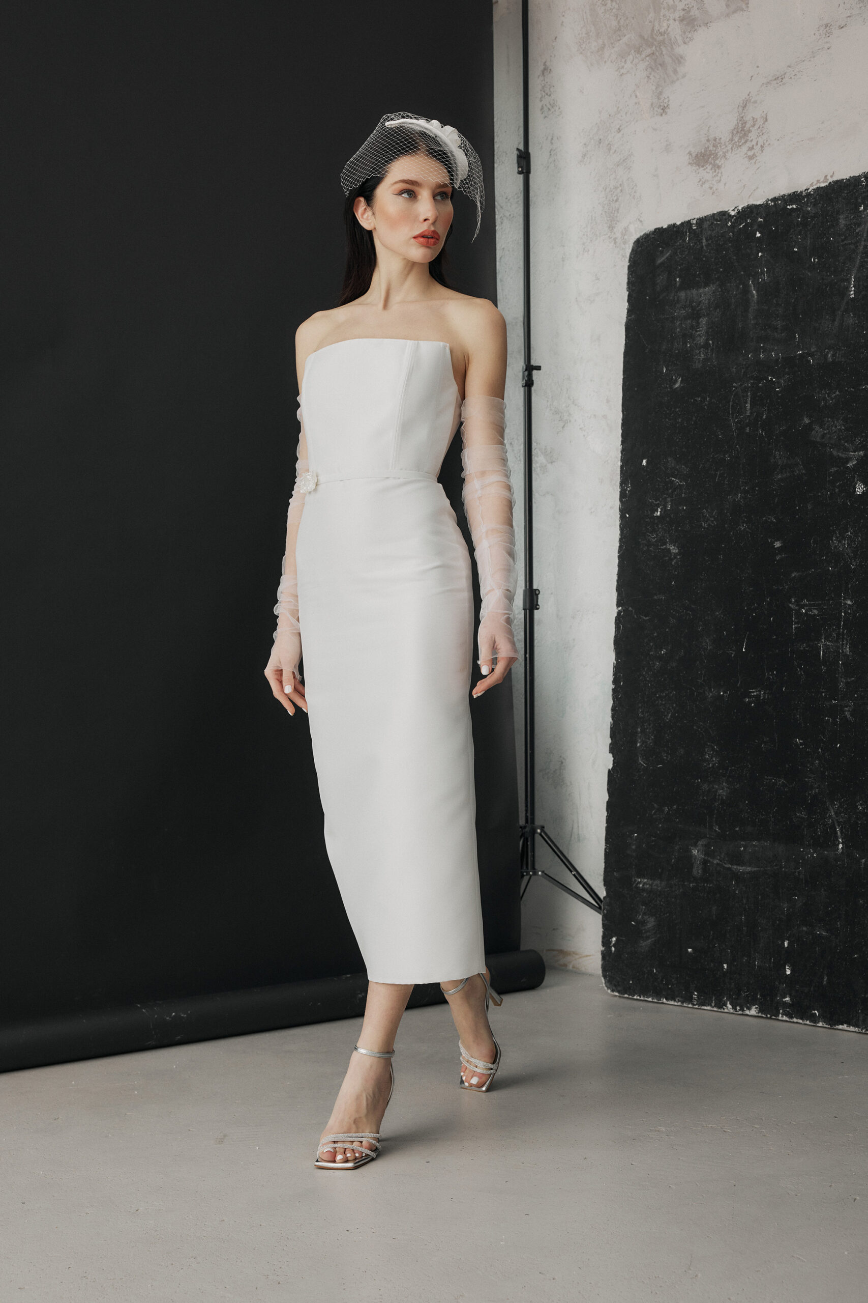 Evie blends clean lines with modern grace. Crafted from structured crepe, this strapless midi dress features a sheer boned back and a back slit for easy movement. A detachable belt with a handcrafted buckle adds a refined finish — perfect for civil weddings or engagement celebrations.