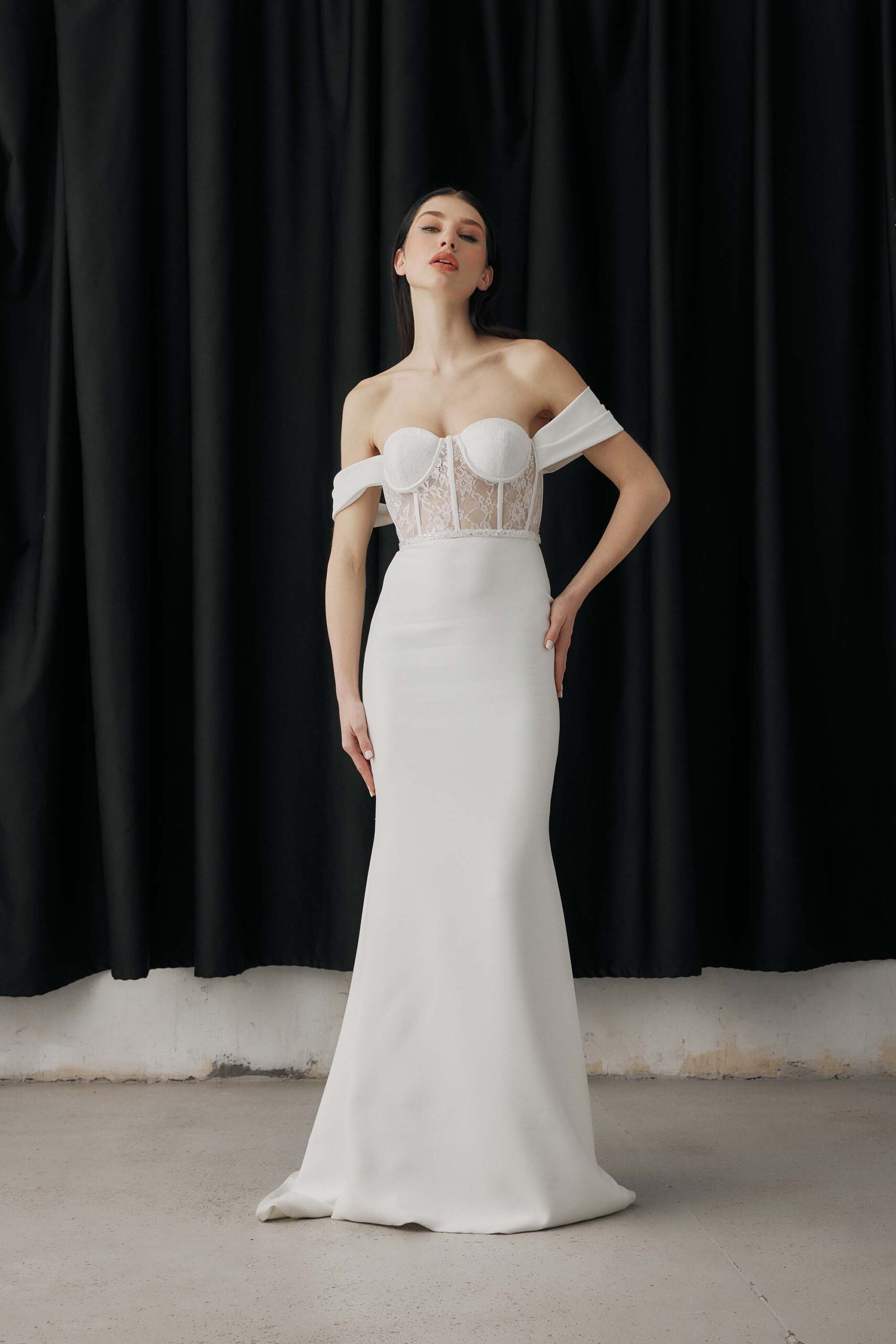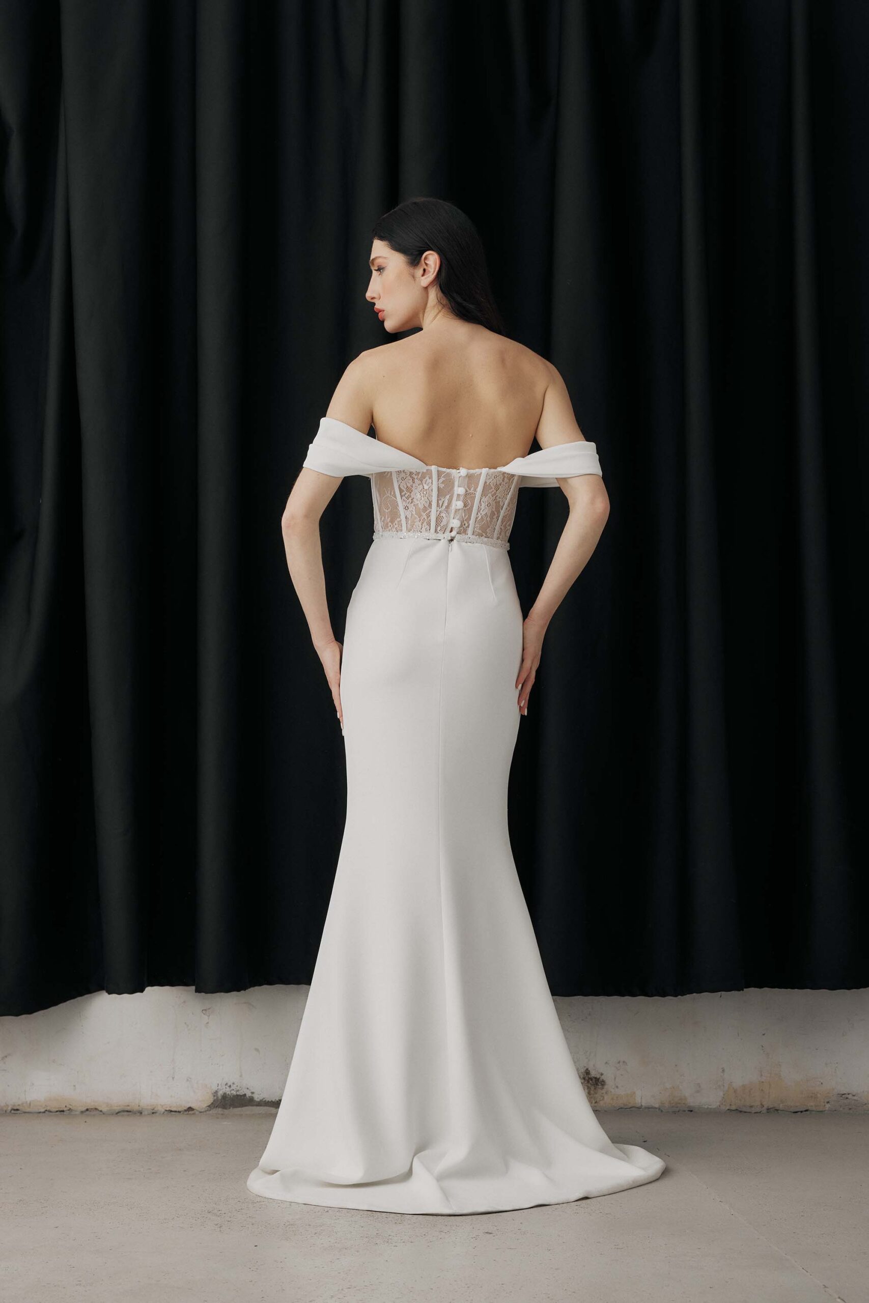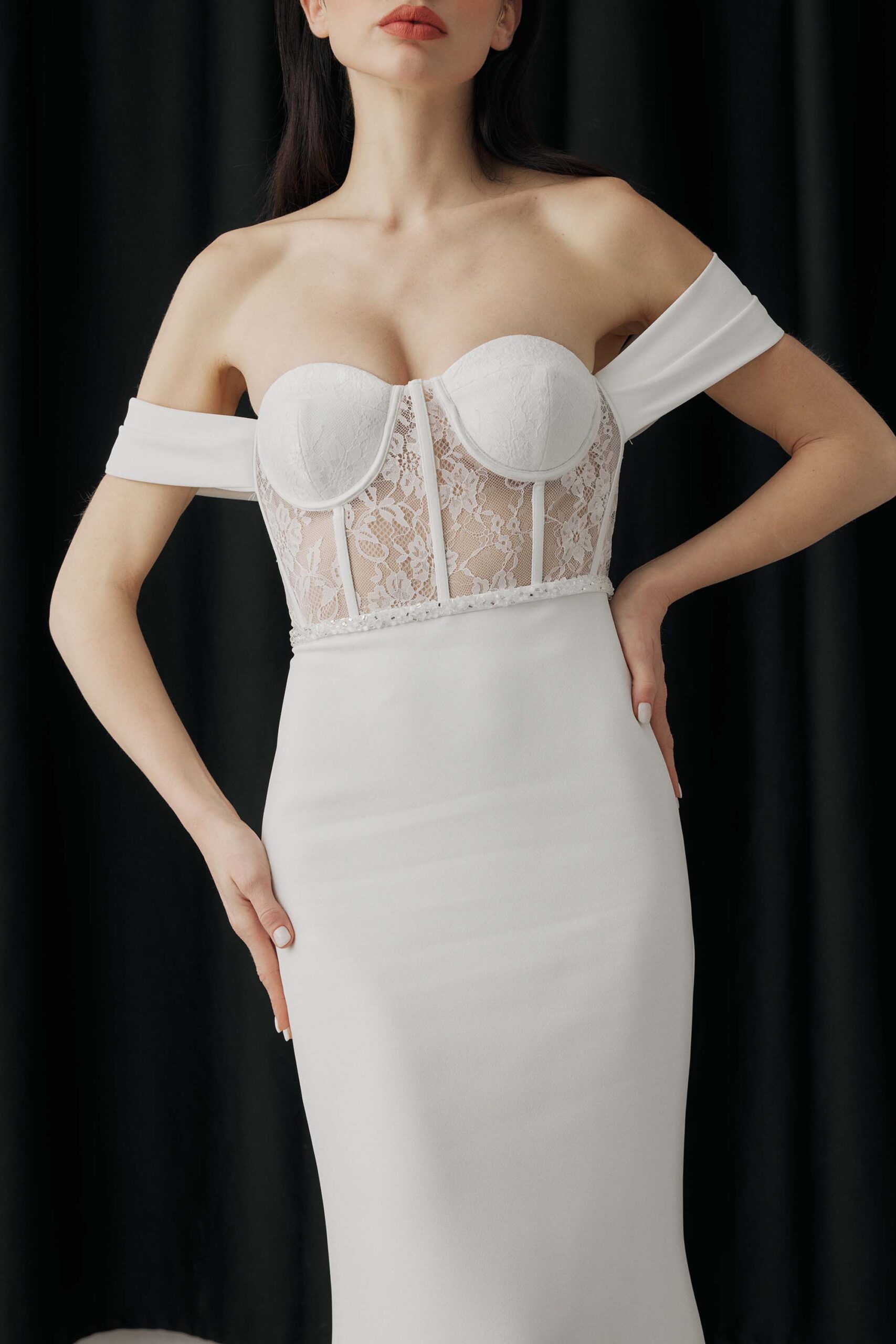 Crafted from French lace and crepe, the sheer boned bodice creates a structured yet delicate look.