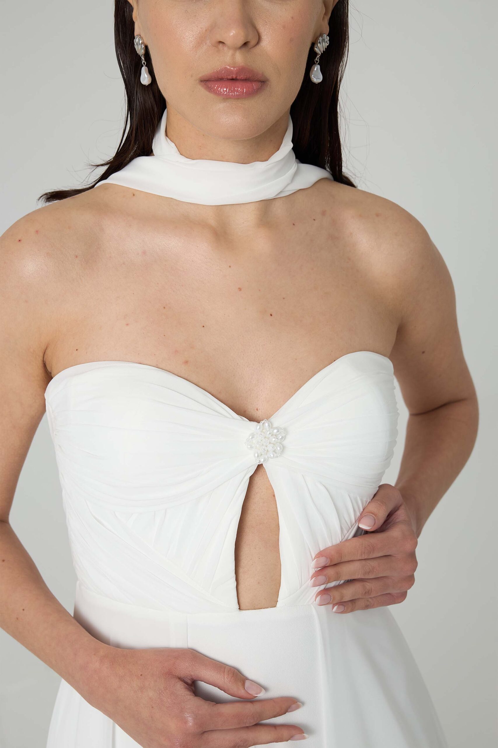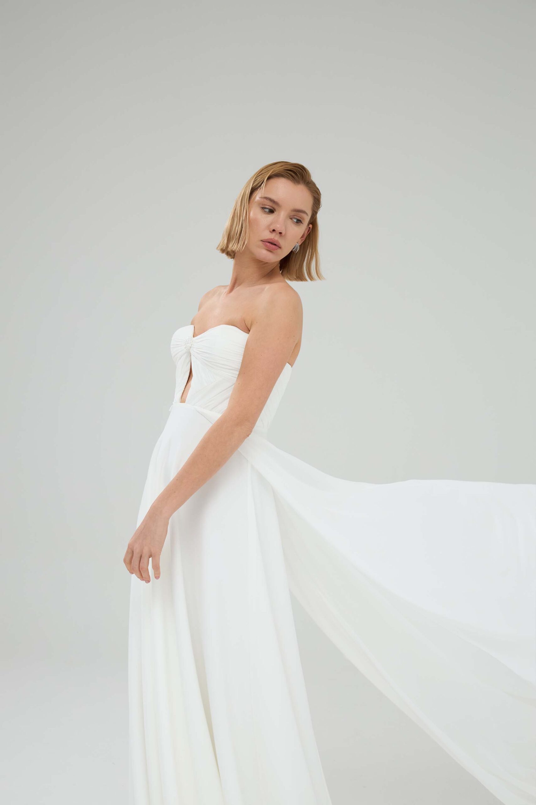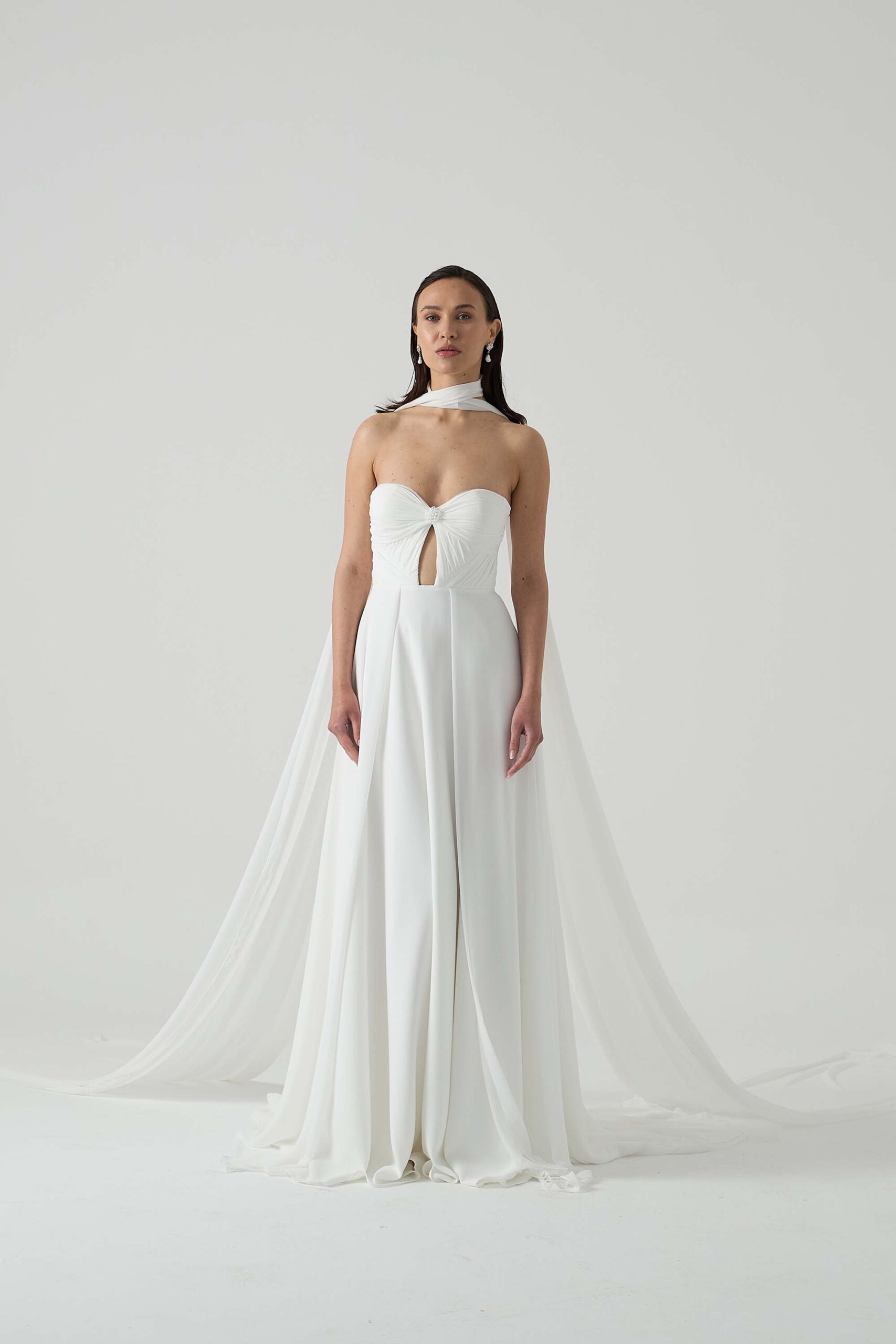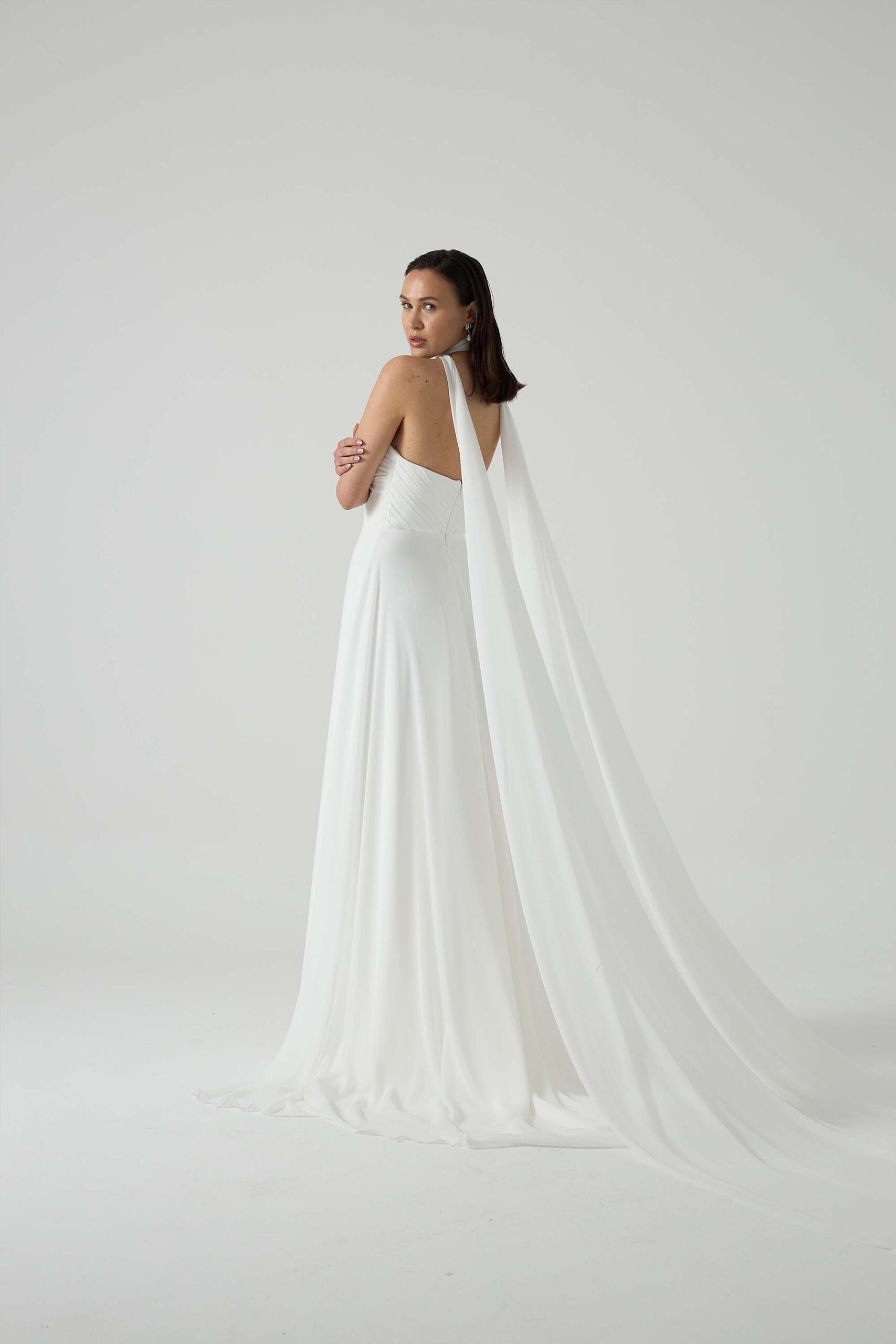 Where timeless elegance meets modern minimalism — Luna is crafted from a flowing blend of Italian crepe and chiffon. Its hand-draped bodice highlights artisanal craftsmanship, while the soft and romantic skirt offers graceful movement with every step.