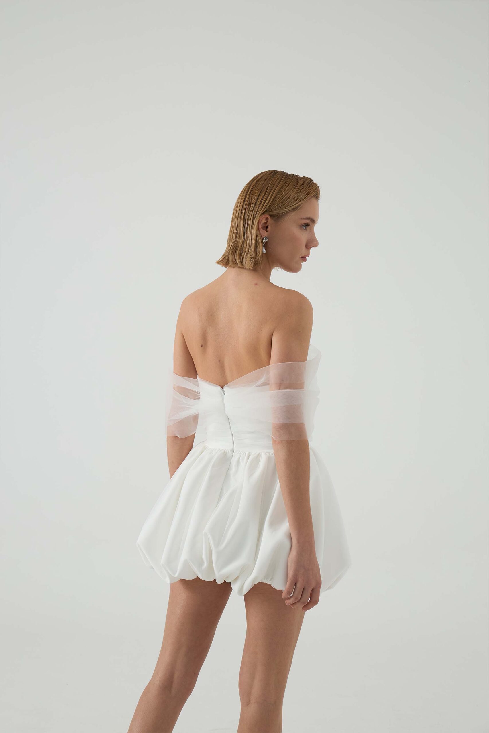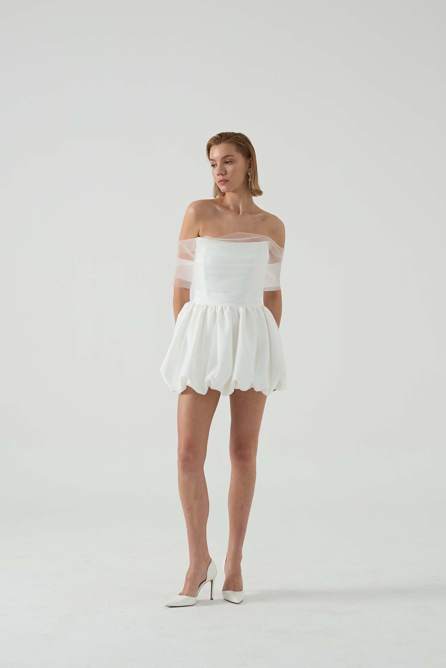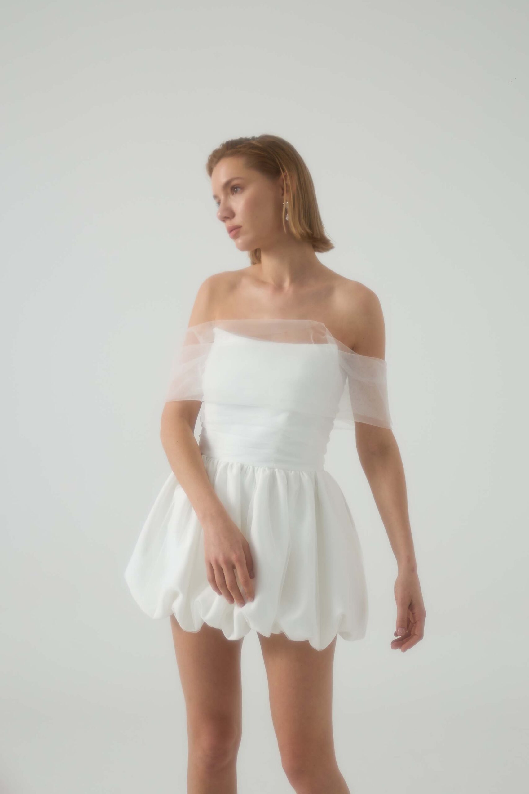 The Luniva Mini is a bold blend of satin and tulle, offering a modern yet feminine design. The mini balloon skirt creates a dynamic silhouette, while the tulle details add elegance and flow. The low shoulder cut gives off a relaxed, chic vibe, and the zipper closure ensures effortless wear.