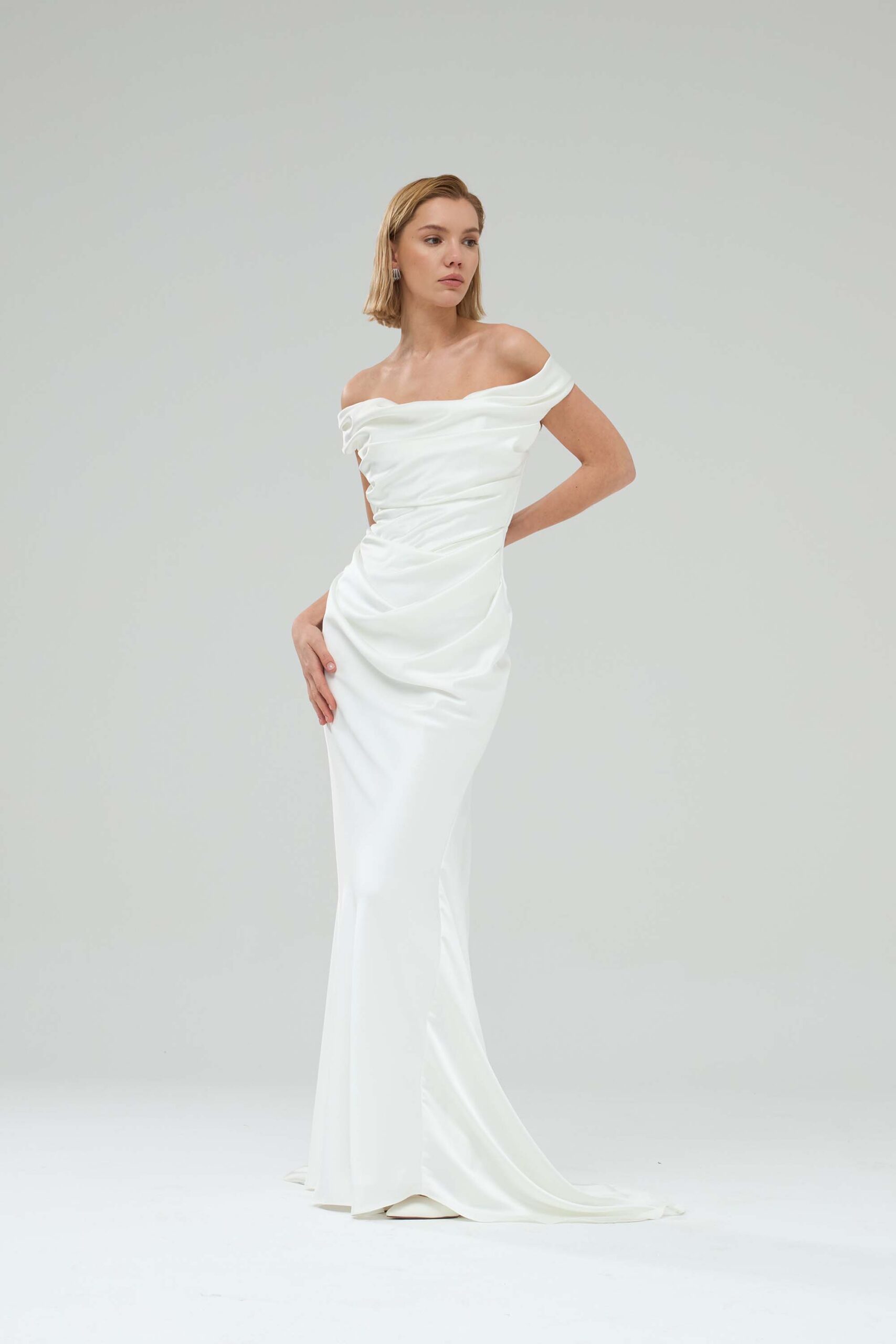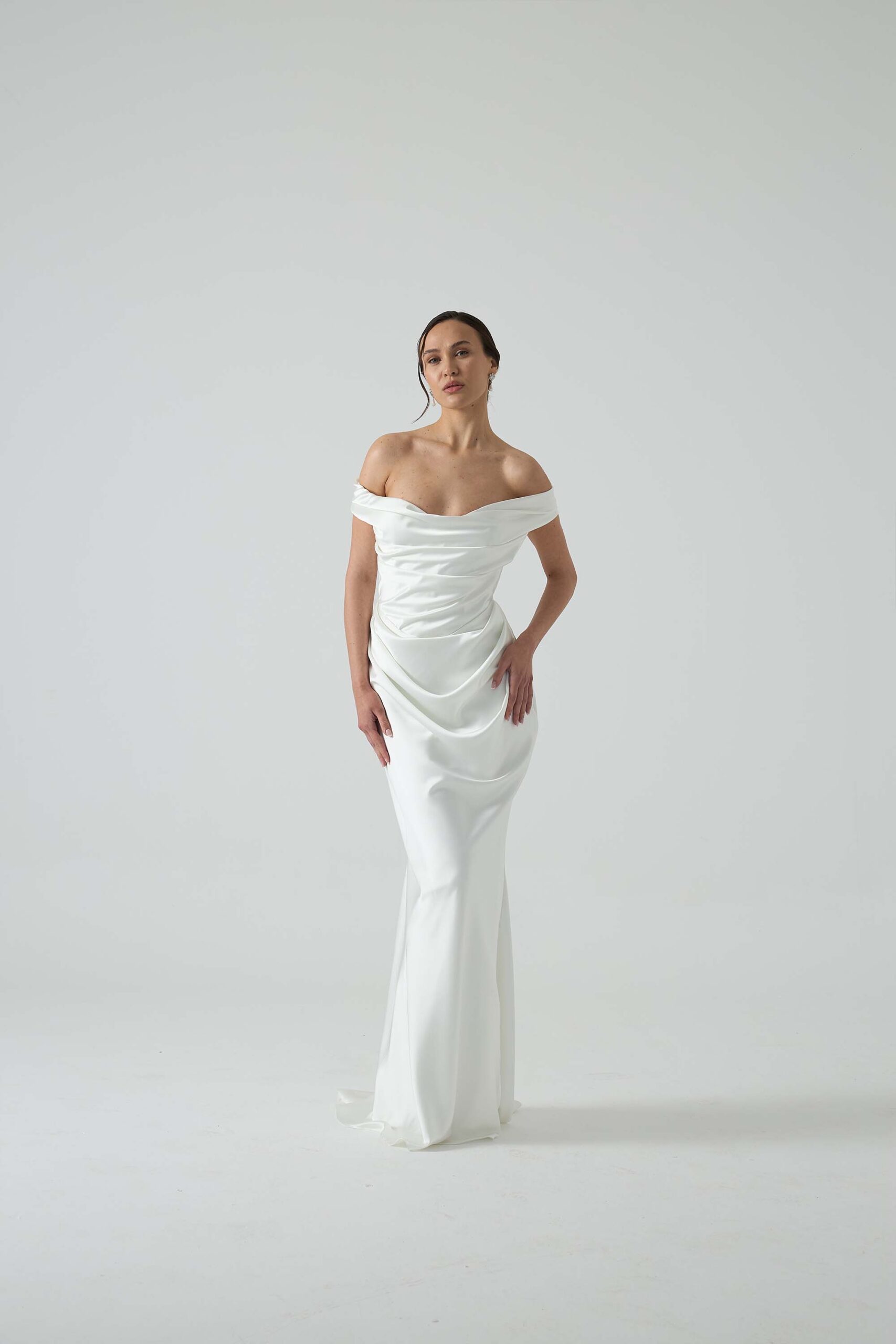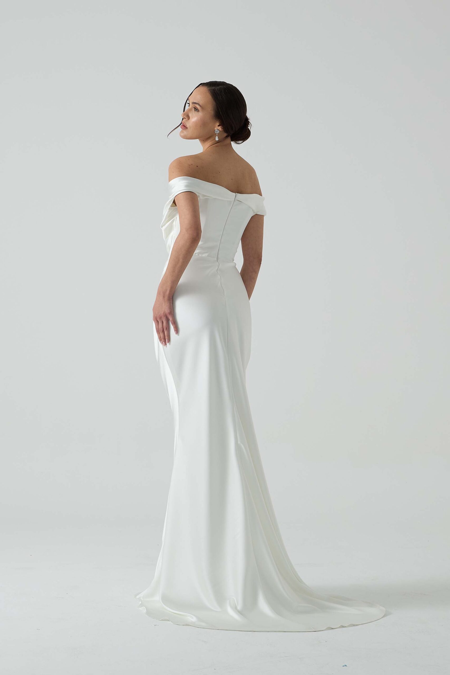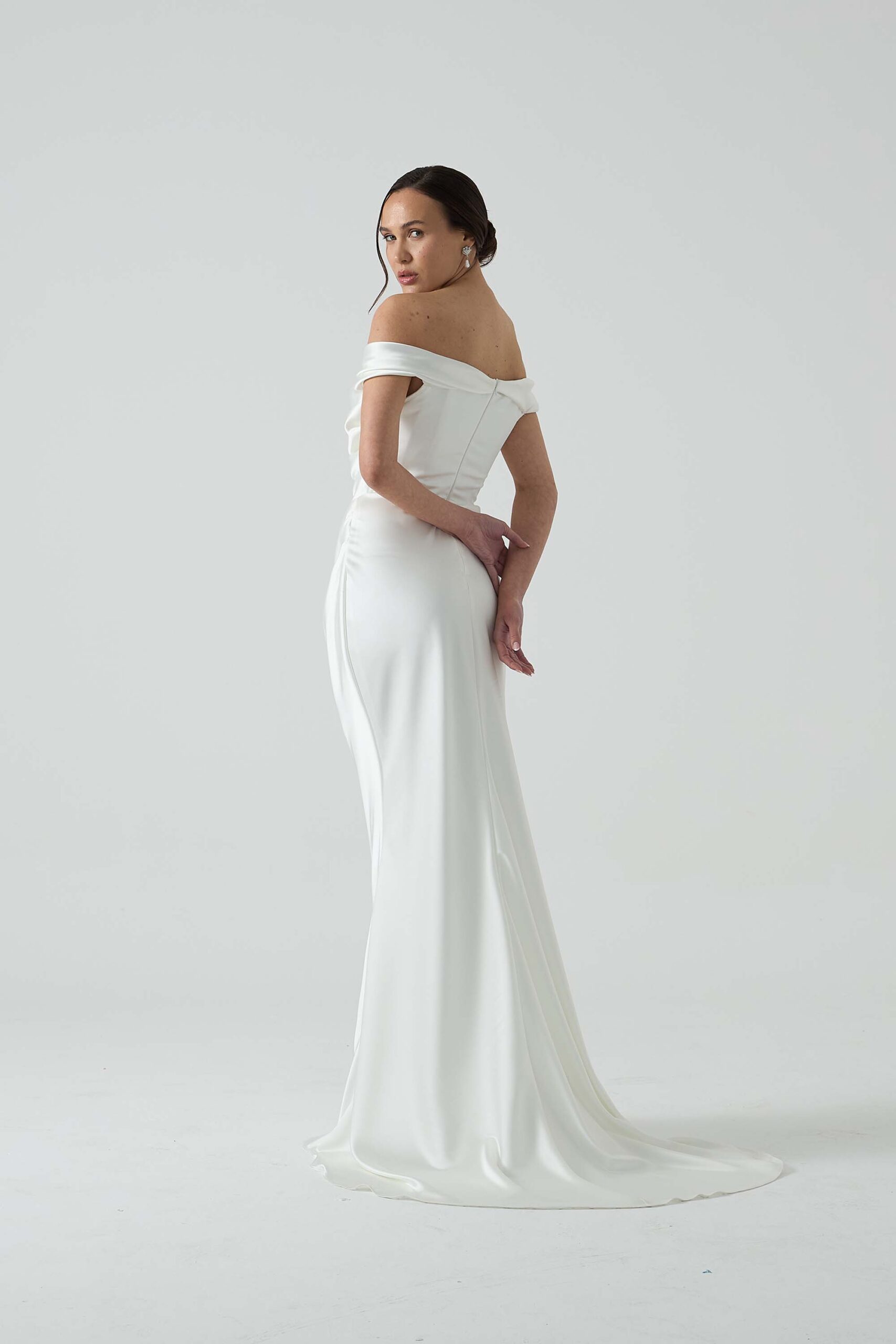 Marlowe is a bold take on modern bridal sophistication. Made from lustrous Versace satin, this off-the-shoulder gown embraces the body with a sculpted mermaid silhouette.