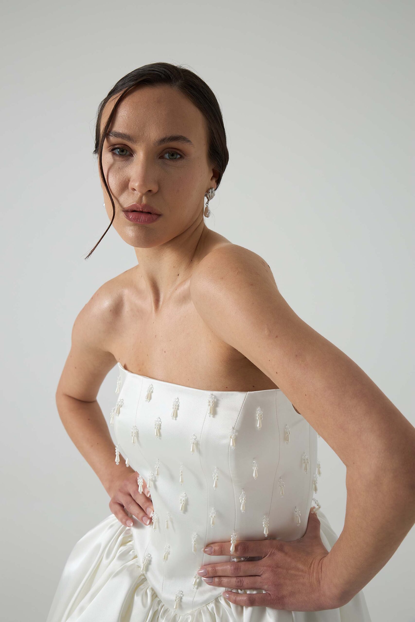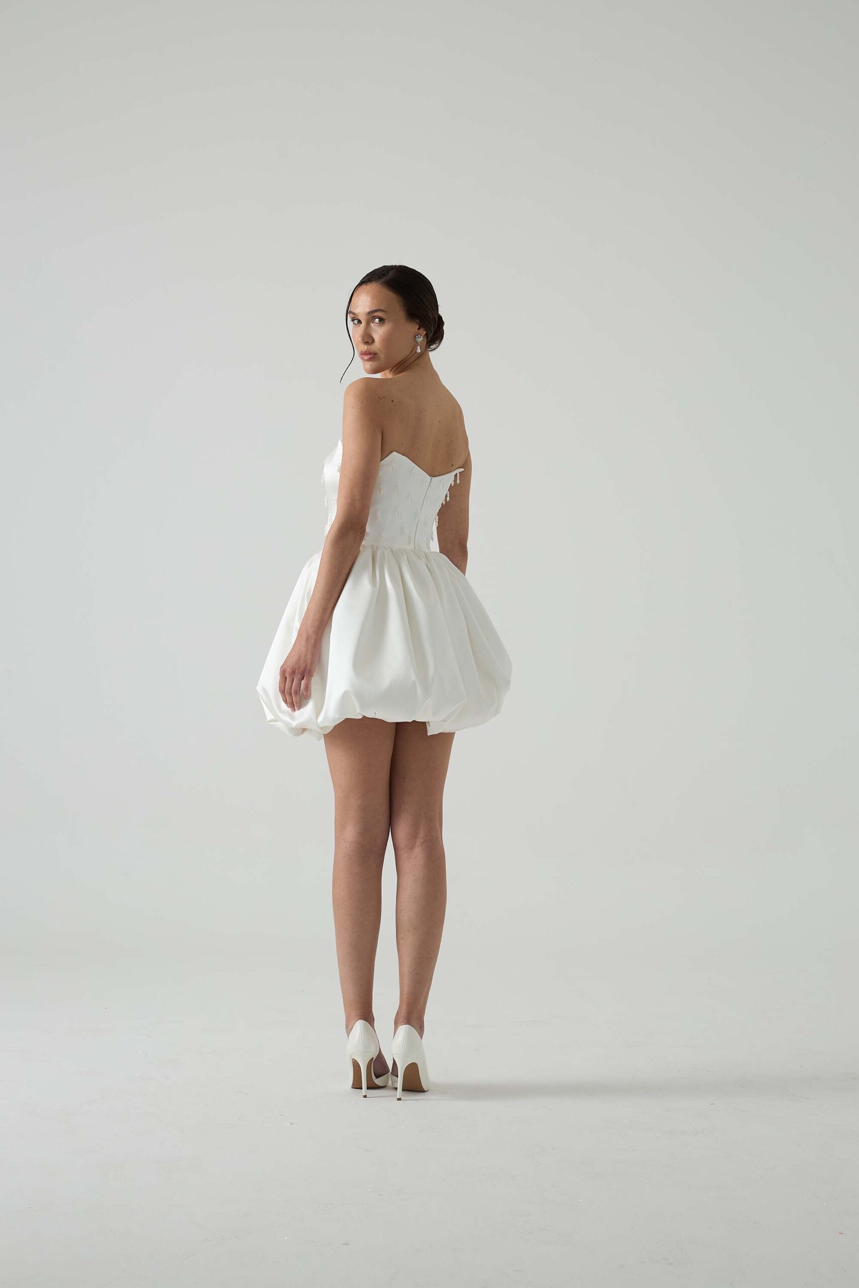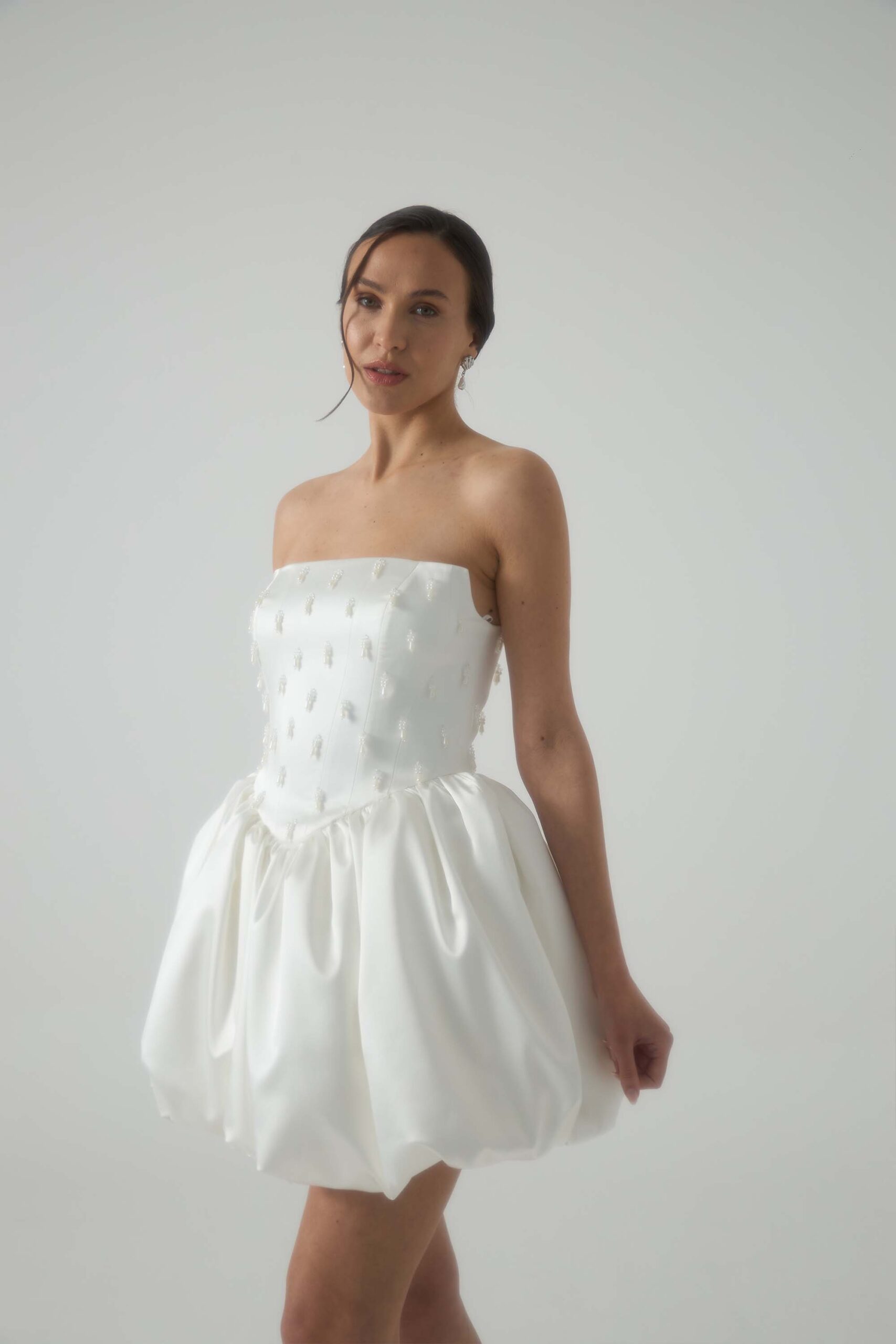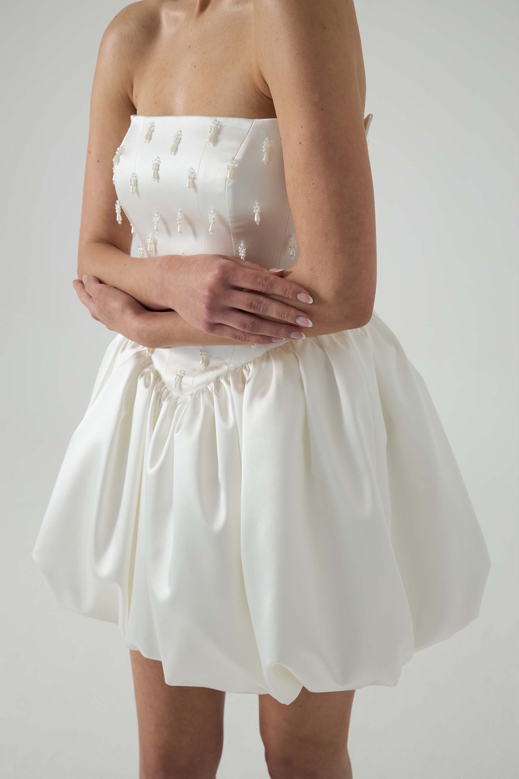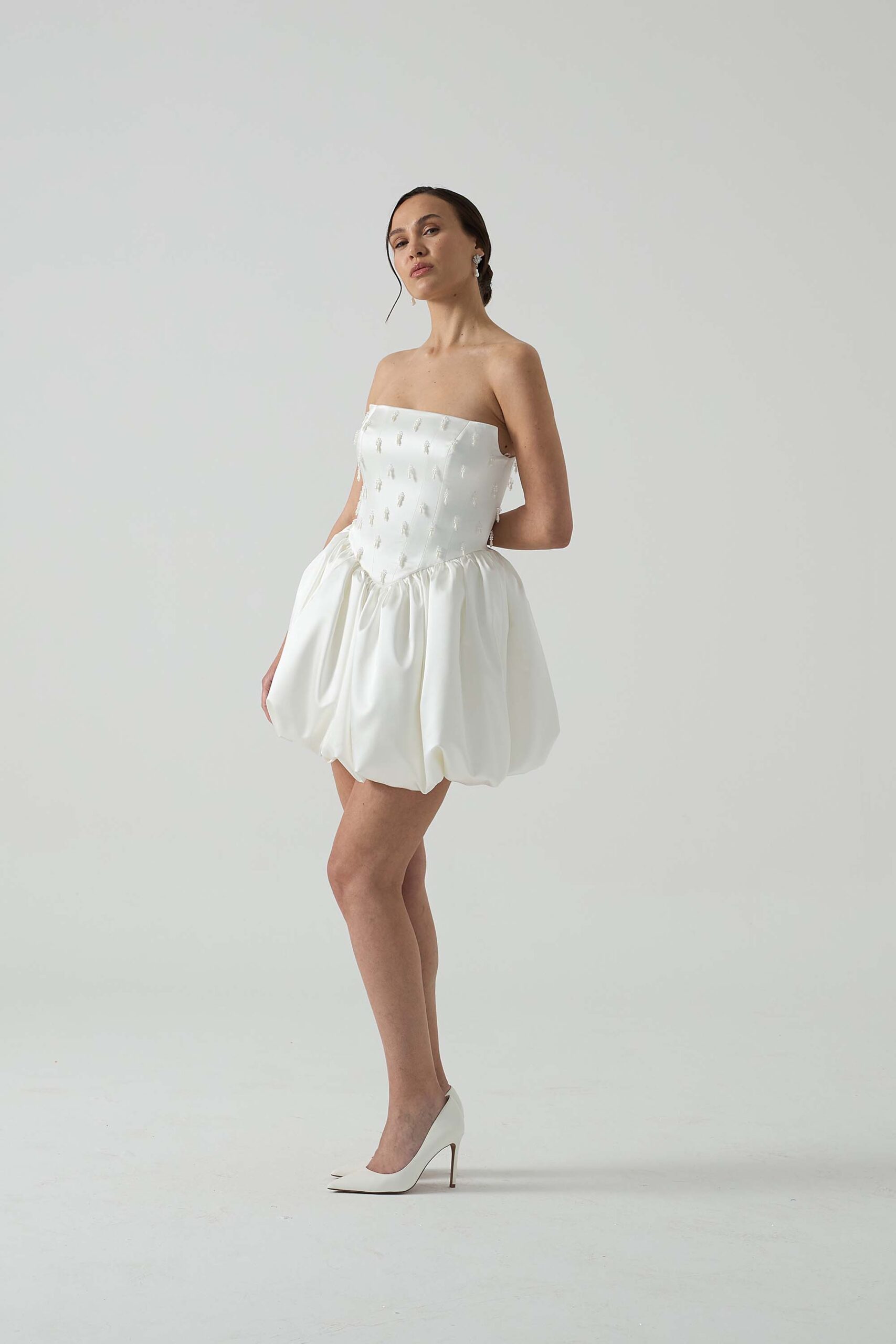 The Noa Mini dress combines modern elegance with a flattering silhouette. Featuring a balloon skirt, strapless front, and structured boning for corset-like support, it accentuates the figure beautifully. The V-shaped waistline and voluminous skirt add a dramatic flair, while delicate pearl embellishments throughout add a refined touch. Ideal for after parties, engagements, or special events.