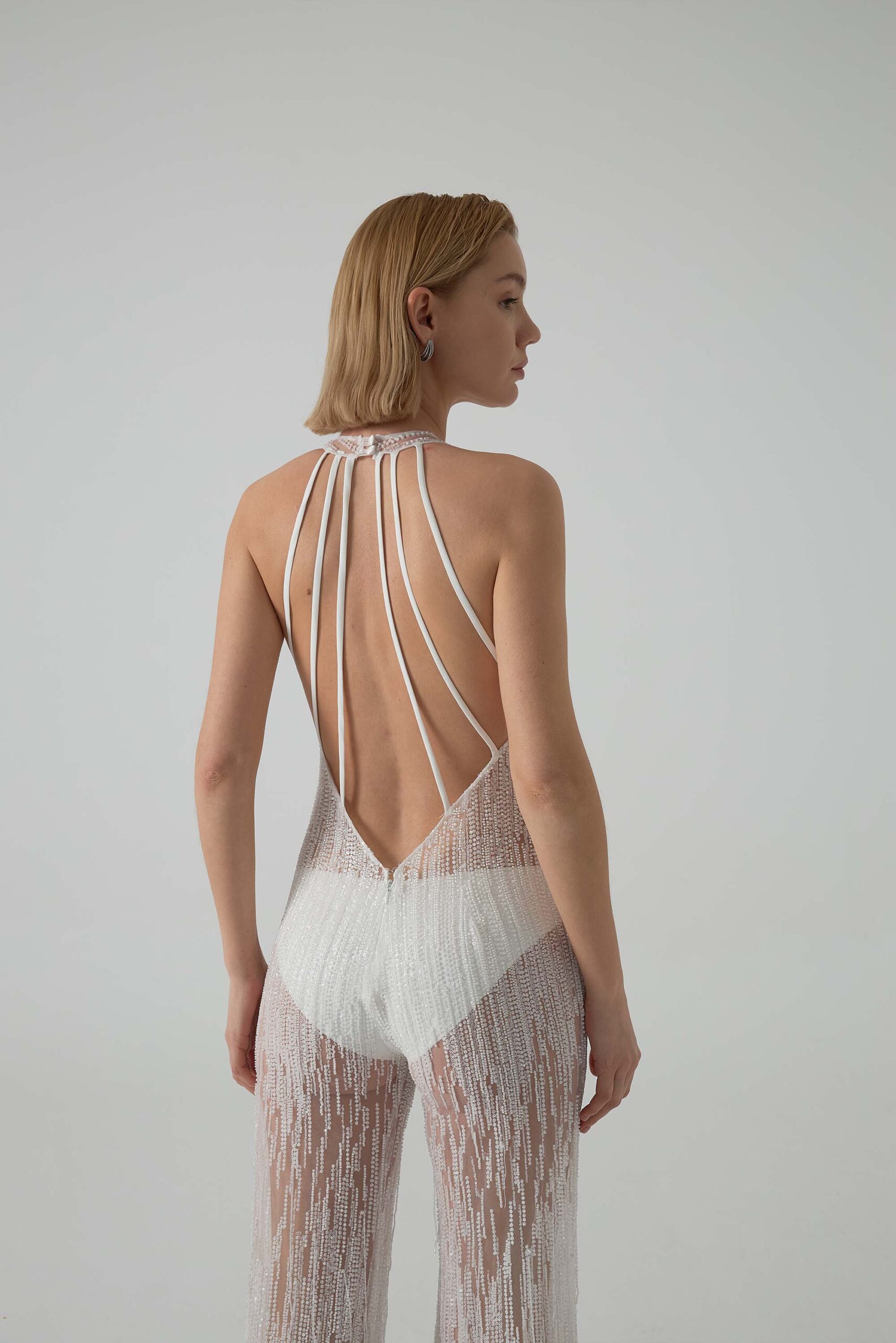 The Riven Jumpsuit combines elegance with bold modernity. Featuring a halter neckline and embroidered fabric, it’s designed with transparent details and a deep back cutout for a daring yet sophisticated look. With fluid pant details and a high-waisted scuba inner piece, this jumpsuit is the perfect choice for chic and lively events and parties.